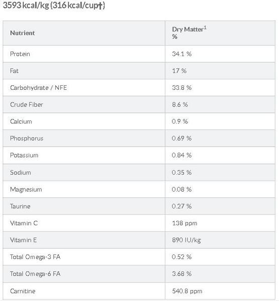 Ingredients: Chicken, Whole Grain Wheat, Corn Gluten Meal, Chicken Fat, Powdered Cellulose, Wheat Gluten, Brewers Rice, Dried Beet Pulp, Pork Flavor, Calcium Sulfate, Lactic Acid, Potassium Chloride, Soybean Oil, Fish Oil, Dicalcium Phosphate, Choline Chloride, Taurine, vitamins (Vitamin E Supplement, L-Ascorbyl-2-Polyphosphate (source of Vitamin C), Niacin Supplement, Thiamine Mononitrate, Vitamin A Supplement, Calcium Pantothenate, Riboflavin Supplement, Biotin, Vitamin B12 Supplement, Pyridoxine Hydrochloride, Folic Acid, Vitamin D3 Supplement), Calcium Carbonate, Iodized Salt, minerals (Ferrous Sulfate, Zinc Oxide, Copper Sulfate, Manganous Oxide, Calcium Iodate, Sodium Selenite), L-Carnitine, Oat Fiber, Mixed Tocopherols for freshness, Natural Flavors, Beta-Carotene, Apples, Broccoli, Carrots, Cranberries, Green Peas.