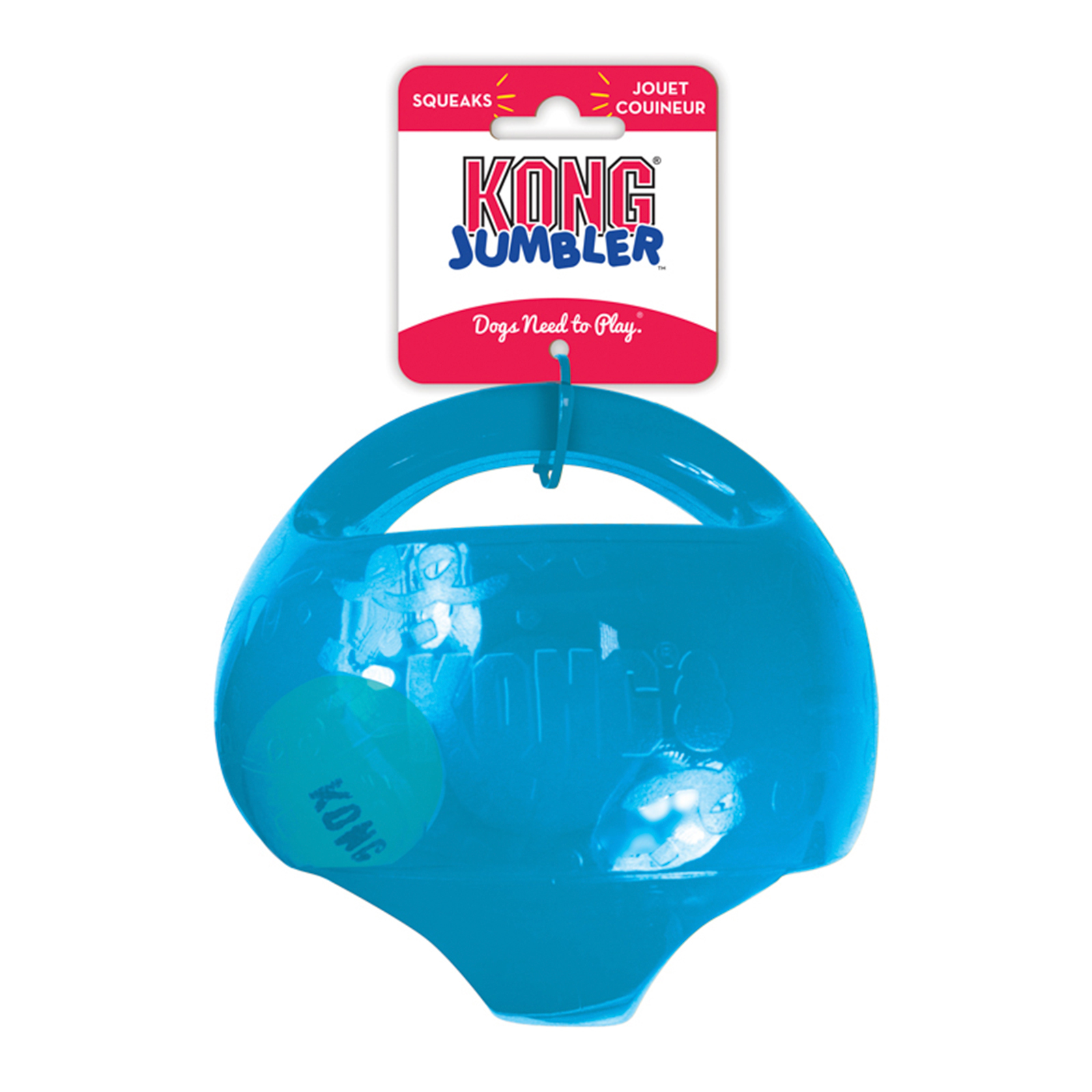 The KONG Jumbler is a two-in-one ball toy for twice the interactive fun. The interior tennis ball and loud squeak entice play, while the handles make pickup and shaking easy. The Jumbler stands up to tough play, making it ideal for games of fetch. Available in two shapes and sizes, the KONG Jumbler will ensure an exciting, active play session for you and your dog.